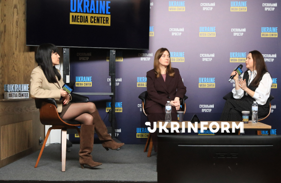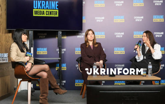 Модераторка Ольга Атаманова, парламентська аналітикиня Руху ЧЕСНО Ірина Корженкова та лідерка Руху ЧЕСНО Віта Думанська (зліва направо) беруть участь у брифінгу на тему: Майбутні вибори: законодавчі зміни та політичні тенденції" у Медіацентрі Україна, Київ, 2 березня 2026 року.