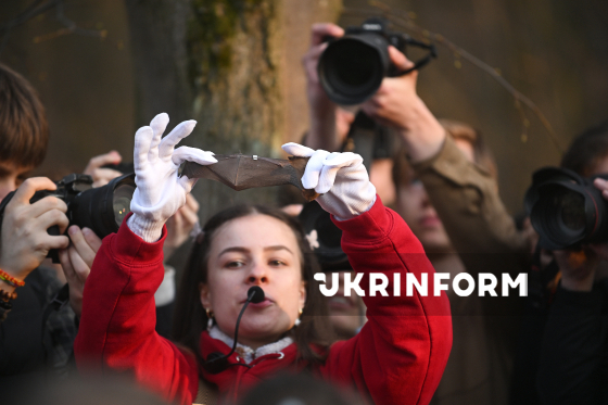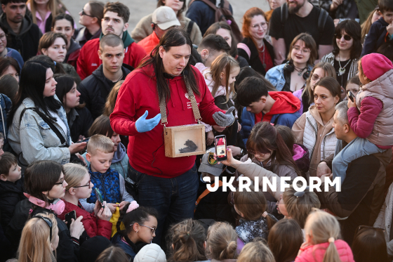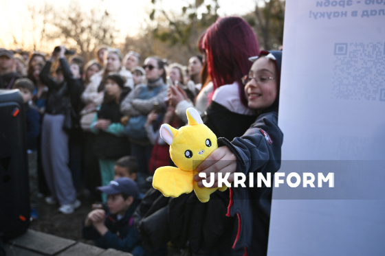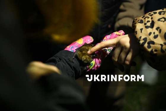 Дівчина тримає у руці іграшку у вигляді кажана під час випуску врятованих восени-взимку кажанів у природне середовище на території Національного природного парку “Голосіївський”, Київ, 4 квітня 2026 року. Цієї зими зоозахисники Українського центру реабілітації рукокрилих врятували понад 500 кажанів у Києві та області. На території НПП “Голосіївський” для них встановили спеціальні будиночки.