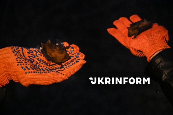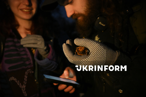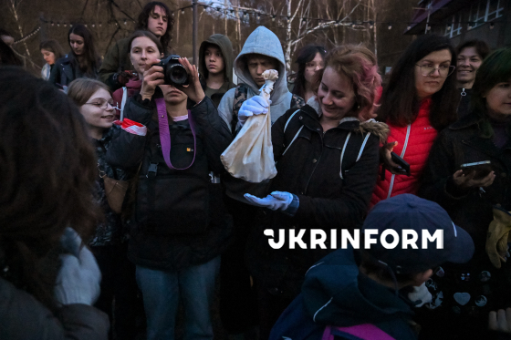 Учасники екоакції випускають врятованих восени-взимку кажанів у природне середовище на території Національного природного парку “Голосіївський”, Київ, 4 квітня 2026 року. Цієї зими зоозахисники Українського центру реабілітації рукокрилих врятували понад 500 кажанів у Києві та області. На території НПП “Голосіївський” для них встановили спеціальні будиночки.