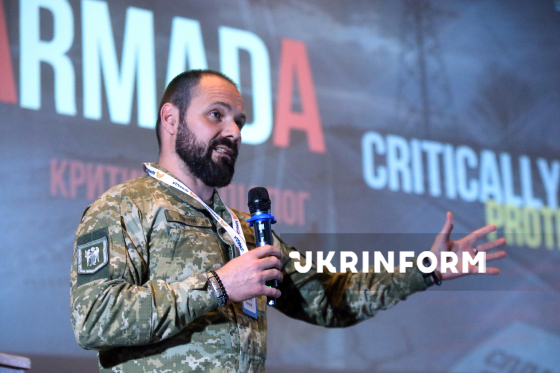 Заступник голови Київської обласної військової адміністрації Андрій Ткачов виголошує промову під форуму виробників безпілотних систем “CRITICALLY PROTECTED. ARMADA TECH DAY”, Київ, 27 березня 2026 року.