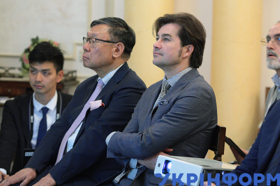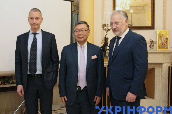 Ексглава Адміністрації Президента України, президент Єврейської конфедерації України Борис Ложкін, Надзвичайний та Повноважний Посол Японії в Україні Шігекі Сумі голова Донецької обласної військово-цивільної адміністрації Павло Жебрівський (зліва направо) під час презентації та прийому на підтримку кандидатури Японії на проведення Всесвітньої виставки 2025 у місті Кансай (Осака) у резиденції Посла Японії, Київ, 2 листопада 2018 року.