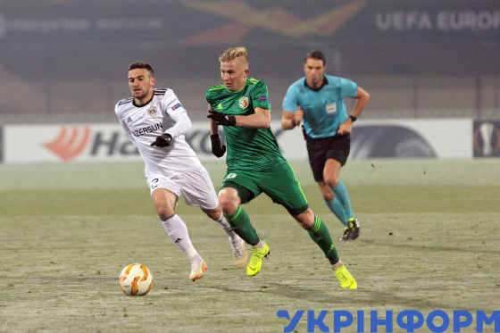 Ігровий момент матчу 4-го туру групового етапу Ліги Європи УЄФА між ФК “Ворскла” (Полтава) і ФК “Карабах” (Агдам, Азербайджан), що завершився з рахунком 0:1 на користь азербайджанської команди, на стадіоні “Ворскла” імені Олексія Бутовського, Полтава, 8 листопада 2018 року.