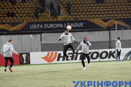 Гравці ФК “Карабах” (Агдам, Азербайджан) тренуються на стадіоні “Ворскла” імені Олексія Бутовського перед матчем 4-го туру групового етапу Ліги Європи УЄФА проти ФК “Ворскла” (Полтава), Полтава, 8 листопада 2018 року.