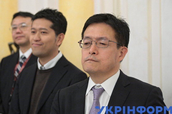 Ексглава Адміністрації Президента України, президент Єврейської конфедерації України Борис Ложкін, Надзвичайний та Повноважний Посол Японії в Україні Шігекі Сумі голова Донецької обласної військово-цивільної адміністрації Павло Жебрівський (зліва направо) під час презентації та прийому на підтримку кандидатури Японії на проведення Всесвітньої виставки 2025 у місті Кансай (Осака) у резиденції Посла Японії, Київ, 2 листопада 2018 року.