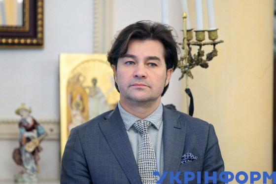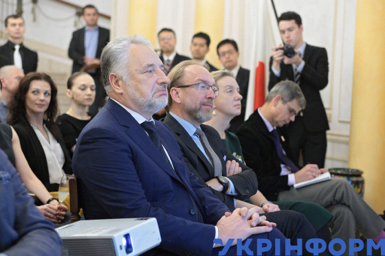 Міністр культури України Євген Нищук під час презентації та прийому на підтримку кандидатури Японії на проведення Всесвітньої виставки 2025 у місті Кансай (Осака) у резиденції Посла Японії, Київ, 2 листопада 2018 року.