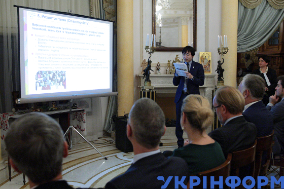 Під час презентації та прийому на підтримку кандидатури Японії на проведення Всесвітньої виставки 2025 у місті Кансай (Осака) у резиденції Посла Японії, Київ, 2 листопада 2018 року.