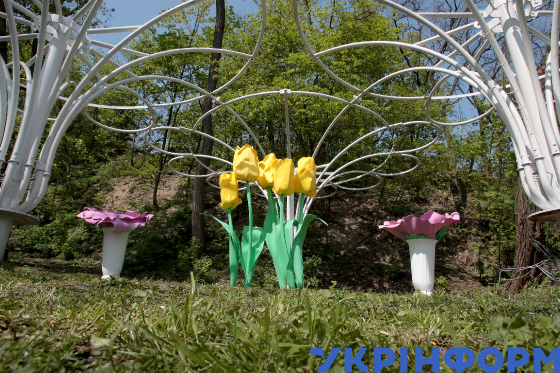 Інсталяція серед квітів під час виставки тюльпанів на Співочому полі у Печерському ландшафтному парку "Співоче", Київ, 25 квітня 2019 року.