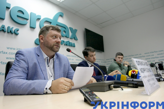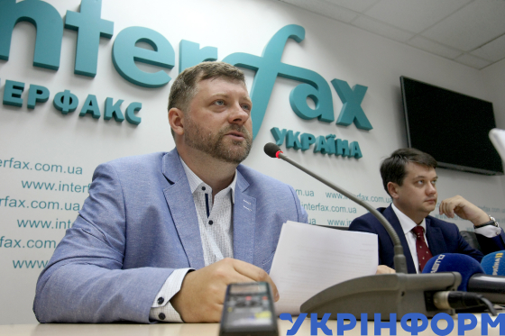 Керівник виборчого штабу політичної партії "Слуга народу" Олександр Корнієнко (ліворуч) під час спільної пресконференції новообраних на з’їзді політичної партії "Слуга народу" керівників щодо початку дострокових парламентських виборів, Київ, 27 травня 2019 року.