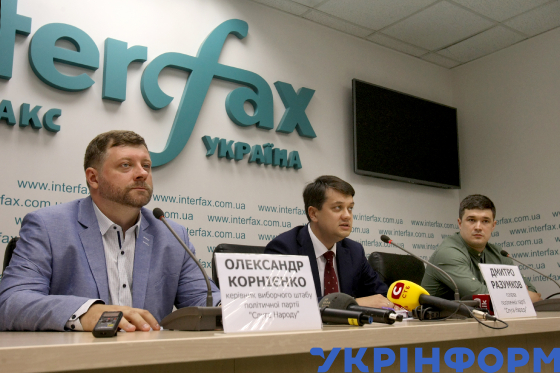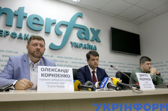 Новообрані на з’їзді політичної партії "Слуга народу" керівник виборчого штабу Олександр Корнієнко, голова партії "Слуга народу" Дмитро Разумков і керівник діджитал-напряму Михайло Федоров (зліва направо) під час спільної пресконференції щодо початку дострокових парламентських виборів, Київ, 27 травня 2019 року.