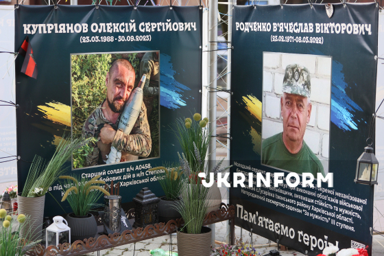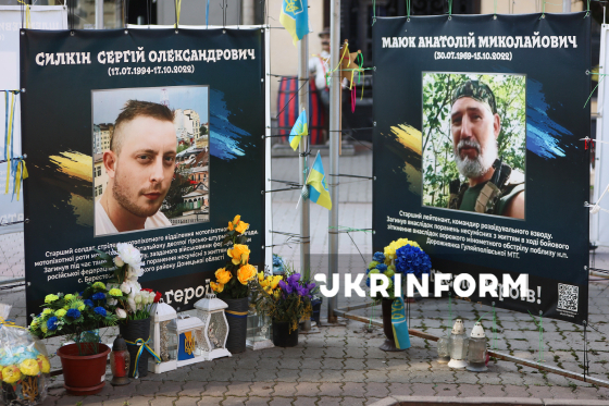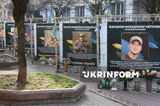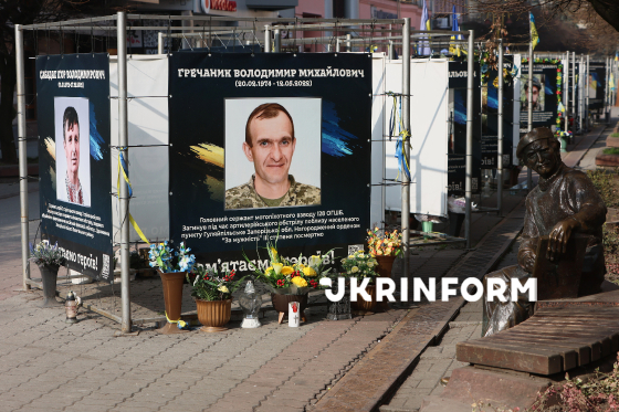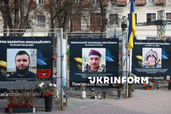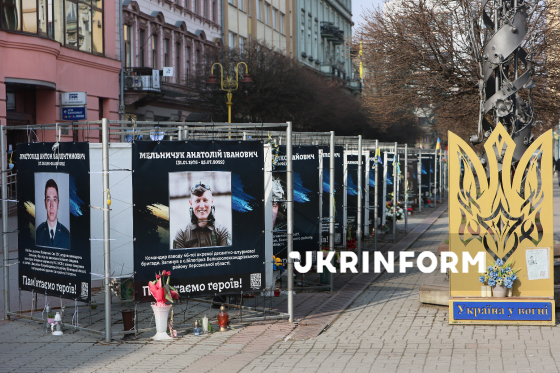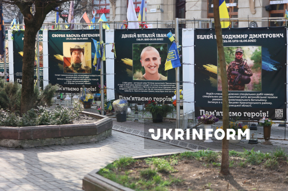 Стенди, присвячені військовослужбовцям Івано-Франківщини, які загинули у російсько-українській війні, на Алеї слави у центрі Івано-Франківська, 25 березня 2026 року.