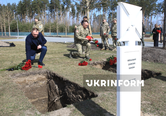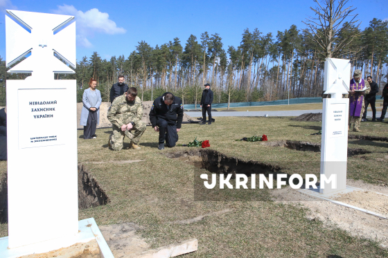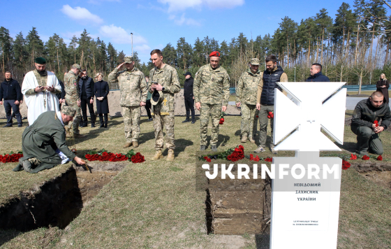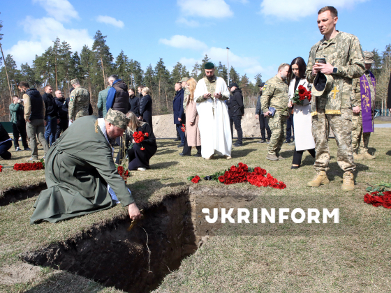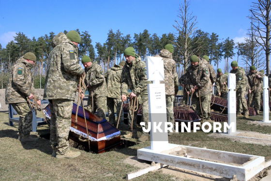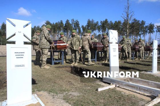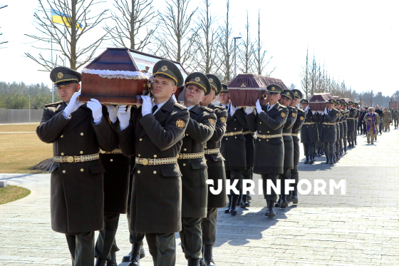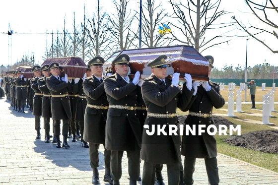 Воїни почесної варти несуть труни під час церемонії почесного поховання невпізнаних тіл (останків) військовослужбовців та поліцейських, які загинули внаслідок збройної агресії проти України, на Національному військовому меморіальному кладовищі, Київська область, 28 березня 2026 року.