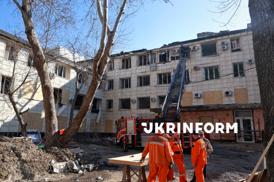 Рятувальник на пожежній драбині ліквідовує наслідки влучання російського БпЛА в будівлю Комунального некомерційного підприємства “Пологовий будинок №5”, Одеса, 28 березня 2026 року. У ніч проти 28 березня російський БпЛА вдарив по пологовому будинку №5, в якому перебували 22 новонароджені дитини, серед них – двійня з критично низькою масою тіла. Завдяки тому, що бомбосховище лікарні обладнане реанімацією для новонароджених, вдалося продовжити вентиляцію у бомбосховищі. Післяопераційних пацієнток перевели в палату інтенсивного нагляду у бомбосховищі. До приїзду рятувальників медики самостійно, за допомогою пожежних рукавів і вогнегасників, ліквідовували пожежі, які виникли в будівлі та на даху пологового. Внаслідок нічної атаки РФ на місто загинули двоє людей, постраждали 12 людей, серед яких – дев`ятирічний хлопчик.