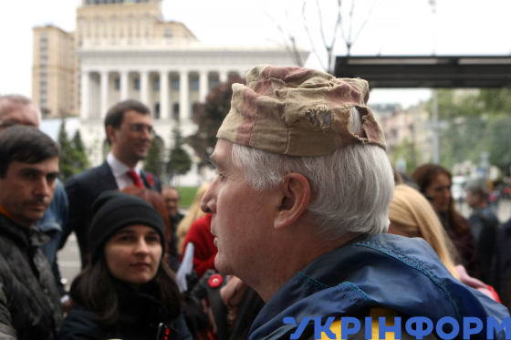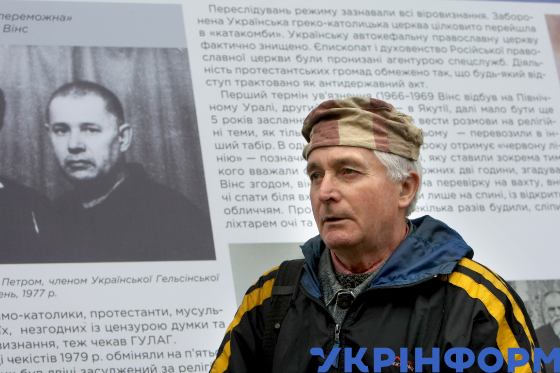 Український дисидент та політв’язень Василь Овсієнко під час відкриття вуличної виставки "Тріумф людини. Мешканці України, які перемогли ГУЛАГ" з нагоди Дня завершення Другої світової війни в Європі біля будівлі Головпоштамту на Хрещатику, Київ, 8 травня 2019 року.