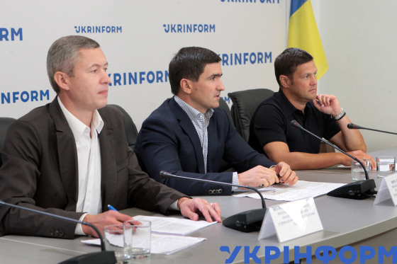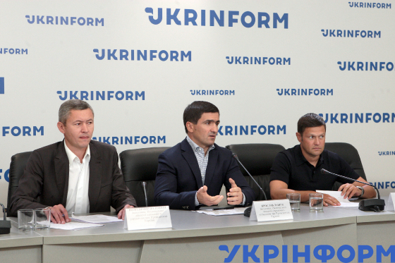 Випускники Національної академії державного управління при Президентові України Володимир Волошин, Ярослав Лащук і Деніс Лялин (зліва направо) під час пресбрифінгу на тему: "Збереження та модернізація Національної академії державного управління при Президентові України" в Українському національному інформаційному агентстві "Укрінформ", Київ, 12 липня 2019 року.