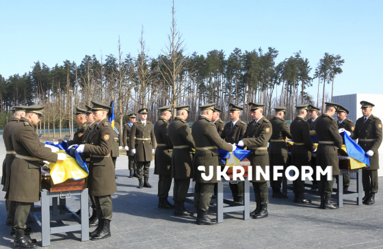 Воїни почесної варти накривають труни державними прапорами України під час церемонії почесного поховання невпізнаних тіл (останків) військовослужбовців та поліцейських, які загинули внаслідок збройної агресії проти України, на Національному військовому меморіальному кладовищі, Київська область, 28 березня 2026 року.