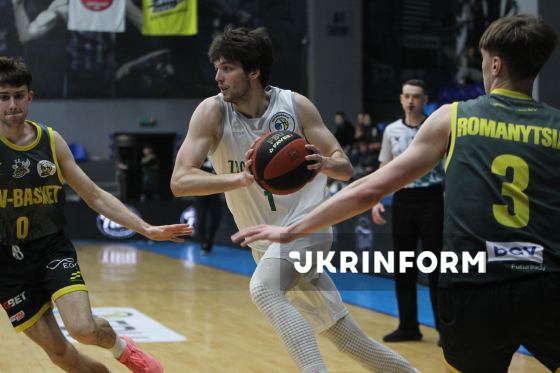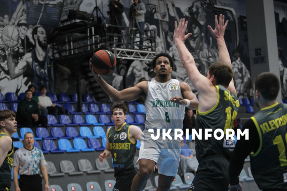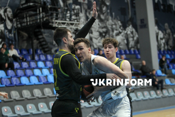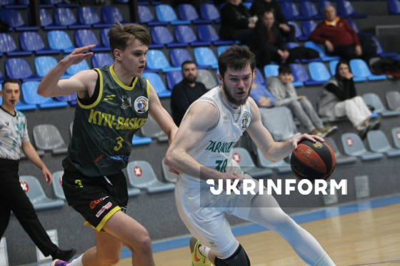 Гравець БК "Запоріжжя" Ілля Ліщина (у центрі) бере участь у матчі чемпіонату України з баскетболу серед команд Суперліги проти БК "Київ-Баскет", що завершився поразкою господарів з рахунком 74:84, на майданчику КСК "Шинник", Дніпро, 28 березня 2026 року.