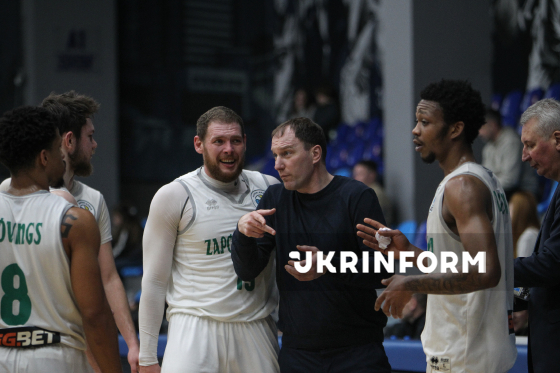 Головний тренер БК "Київ-Баскет" Дмитро Забірченко (праворуч) та гравець команди Богдан Маліч спілкуються в межах чемпіонату України з баскетболу серед команд Суперліги проти БК "Запоріжжя", що завершився поразкою господарів з рахунком 74:84, на майданчику КСК "Шинник", Дніпро, 28 березня 2026 року.