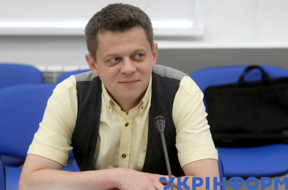 Ведучий фестивалю, режисер Народного фольклорного ансамблю "Червона калина" КП "Київський метрополітен" Роман Нагірний під час пресконференції на тему: "Пісня над Дніпром": Всеукраїнський фестиваль хорового мистецтва" в Українському національному інформаційному агентстві "Укрінформ", Київ, 23 травня 2019 року.