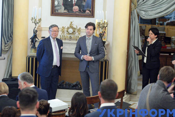 Під час презентації та прийому на підтримку кандидатури Японії на проведення Всесвітньої виставки 2025 у місті Кансай (Осака) у резиденції Посла Японії, Київ, 2 листопада 2018 року.
