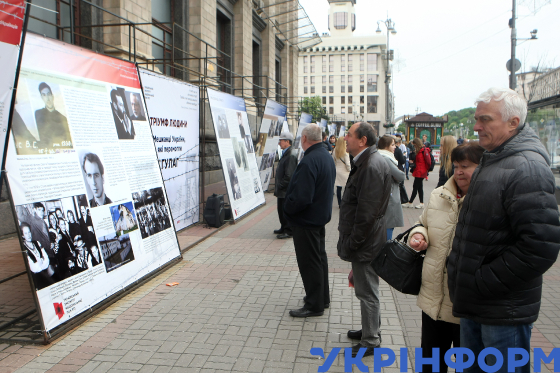 Мешканці міста під час відкриття вуличної виставки "Тріумф людини. Мешканці України, які перемогли ГУЛАГ" з нагоди Дня завершення Другої світової війни в Європі роздивляються тематичні стенди біля будівлі Головпоштамту на Хрещатику, Київ, 8 травня 2019 року.