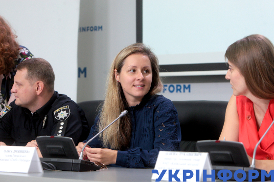 Старший лейтенант поліції, інспектор відділу зв’язків з громадськістю Управління патрульної поліції в місті Києві Сергій Багаліка, голова Громадської організації Traffic Challenge Ольга Дробишева і директорка, головна лікарка КНП "Київський міський центр громадського здоров’я" Олена Лукашевич (зліва направо) під час пресконференції на тему: "Чому гинуть люди на пішохідних переходах та як цьому запобігти?" в Українському національному інформаційному агентстві "Укрінформ", Київ, 29 серпня 2019 року.