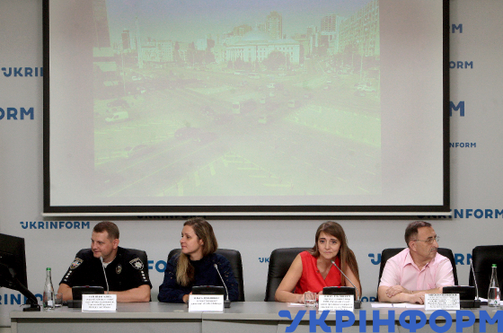Старший лейтенант поліції, інспектор відділу зв’язків з громадськістю Управління патрульної поліції в місті Києві Сергій Багаліка, голова Громадської організації Traffic Challenge Ольга Дробишева, директорка, головна лікарка КНП "Київський міський центр громадського здоров’я" Олена Лукашевич і начальник служби з контролю за розміщенням та технічним станом ТЗРДР та вдосконалення безпеки дорожнього руху КП "Центр організації дорожнього руху" Микола Євдокимов (зліва направо) під час пресконференції на тему: "Чому гинуть люди на пішохідних переходах та як цьому запобігти?" в Українському національному інформаційному агентстві "Укрінформ", Київ, 29 серпня 2019 року.
