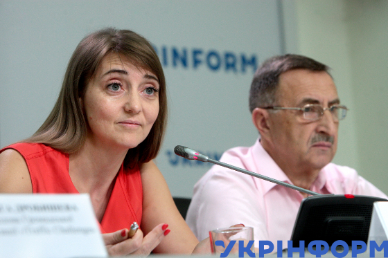 Директорка, головна лікарка КНП "Київський міський центр громадського здоров’я" Олена Лукашевич і начальник служби з контролю за розміщенням та технічним станом ТЗРДР та вдосконалення безпеки дорожнього руху КП "Центр організації дорожнього руху" Микола Євдокимов (зліва направо) під час пресконференції на тему: "Чому гинуть люди на пішохідних переходах та як цьому запобігти?" в Українському національному інформаційному агентстві "Укрінформ", Київ, 29 серпня 2019 року.