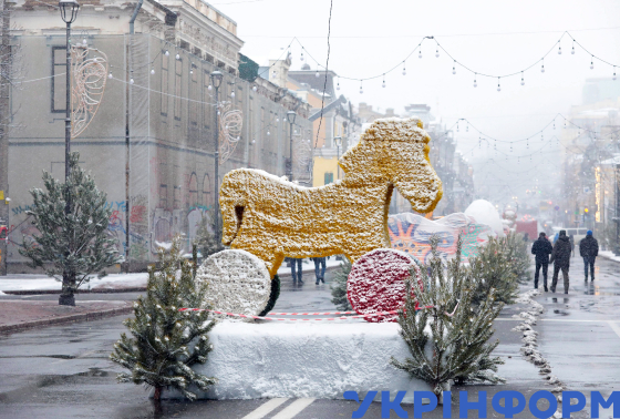 Зрізані маленькі сосни, встановлені біля засніженої фігури у вигляді іграшкового коня з колесами, під час снігопаду на вулиці міста, Київ, 12 грудня 2018 року.