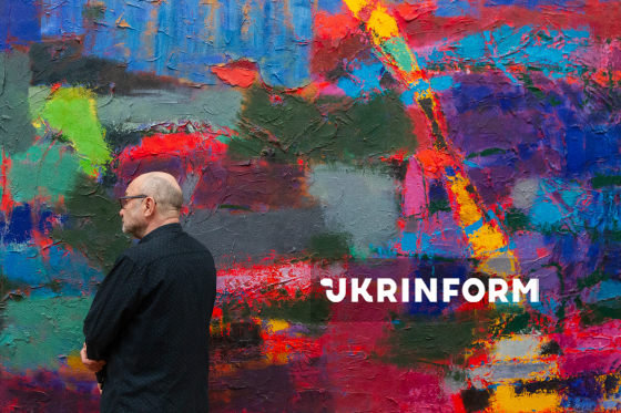 Відвідувач роздивляється експонат персональної виставки живописця Петра Лебединця "Колір" у Національному музеї "Київська картинна галерея", Київ, 31 березня 2026 року. Експозиція об’єднала 30 абстрактних та імпресіоністичних полотен художника. Одним із елементів виставки стала мультимедійна інсталяція, створена на основі живопису митця, яку раніше використали у сценографії балетного перформансу LISOVA в Одеському національному академічному театрі опери та балету.