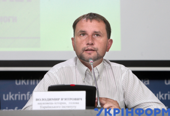 Голова Українського інституту національної пам’яті Володимир В’ятрович під час прес-заходу на тему: "Як Україна вшанує п’яту річницю звільнення міст сходу?" в Українському національному інформаційному агентстві "Укрінформ", Київ, 1 липня 2019 року.