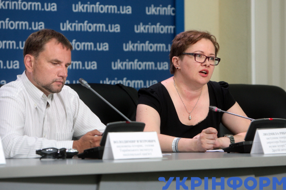 Голова Українського інституту національної пам’яті Володимир В’ятрович і заступниця генерального директора Національного музею історії України у Другій світовій війні Людмила Рибченко (зліва направо) під час прес-заходу на тему: "Як Україна вшанує п’яту річницю звільнення міст сходу?" в Українському національному інформаційному агентстві "Укрінформ", Київ, 1 липня 2019 року.