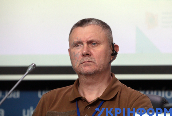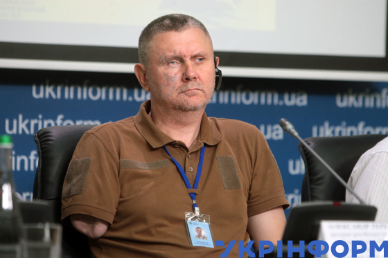 Ветеран російсько-української війни, кавалер Ордену "За мужність" ІІІ ступеню, заступник міністра у справах ветеранів України Олександр Терещенко під час прес-заходу на тему: "Як Україна вшанує п’яту річницю звільнення міст сходу?" в Українському національному інформаційному агентстві "Укрінформ", Київ, 1 липня 2019 року.