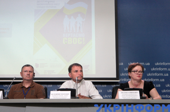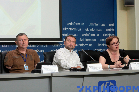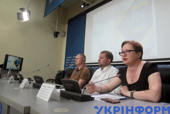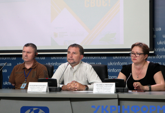 Ветеран російсько-української війни, кавалер Ордену "За мужність" ІІІ ступеню, заступник міністра у справах ветеранів України Олександр Терещенко, голова Українського інституту національної пам’яті Володимир В’ятрович і заступниця генерального директора Національного музею історії України у Другій світовій війні Людмила Рибченко (зліва направо) під час прес-заходу на тему: "Як Україна вшанує п’яту річницю звільнення міст сходу?" в Українському національному інформаційному агентстві "Укрінформ", Київ, 1 липня 2019 року.