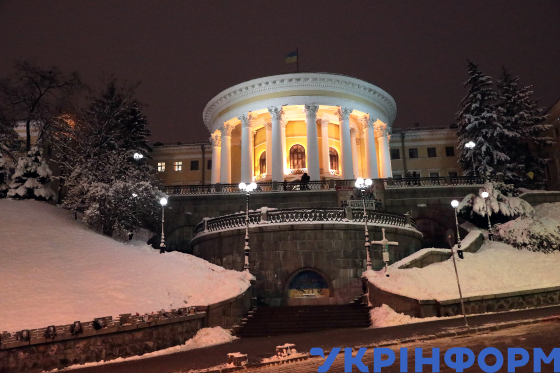 Жовтневий палац з прапором України на даху і засніжені ялини поруч з Майданом Незалежності, Київ, 20 грудня 2018 року.
