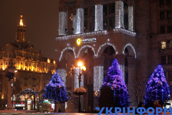 Прикрашені новорічними гірляндами дерева і будівля Головпоштамту на засніженому Майдані Незалежності, Київ, 20 грудня 2018 року.