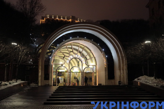 Підсвічений вхід до київського фунікулеру на Поштовій площі, Київ, 20 грудня 2018 року.