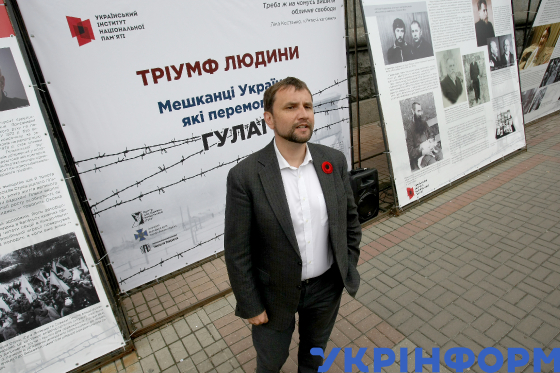 Директор Українського інституту національної пам’яті Володимир В’ятрович під час відкриття вуличної виставки "Тріумф людини. Мешканці України, які перемогли ГУЛАГ" з нагоди Дня завершення Другої світової війни в Європі біля будівлі Головпоштамту на Хрещатику, Київ, 8 травня 2019 року.