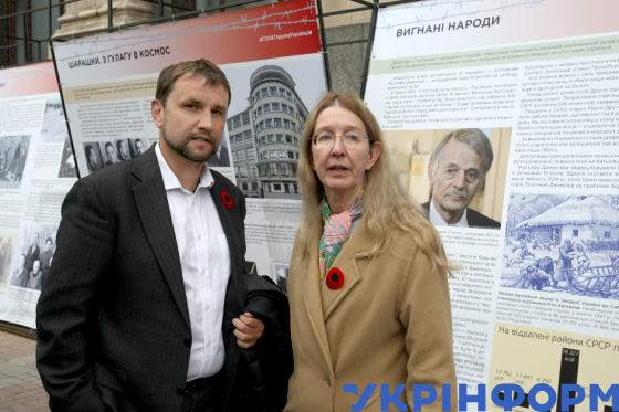 Директор Українського інституту національної пам’яті Володимир В’ятрович та в. о. міністра охорони здоров’я України Уляна Супрун під час відкриття вуличної виставки "Тріумф людини. Мешканці України, які перемогли ГУЛАГ" з нагоди Дня завершення Другої світової війни в Європі біля будівлі Головпоштамту на Хрещатику, Київ, 8 травня 2019 року.