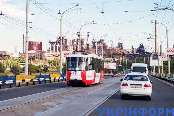 Трамвай та автомобілі їдуть мостом, перильна огорожа якого розфарбована в кольори прапора України, Маріуполь, Донецька область, 29 серпня 2014 року. Фото Дмитра Смольєнка.