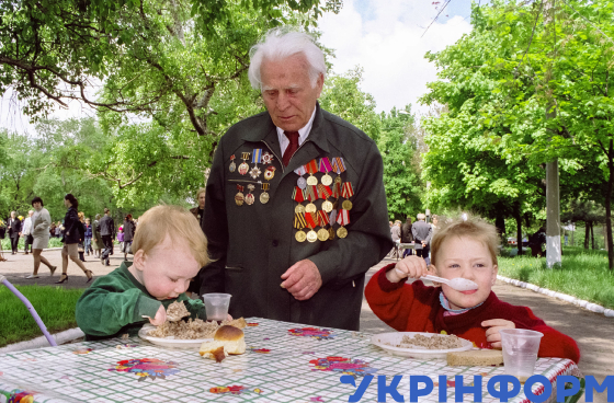 Ветеран із правнуками в міському парку в День Перемоги, Маріуполь, Донецька область, 9 травня 2006 року. Фото Аліни Комарової.