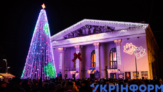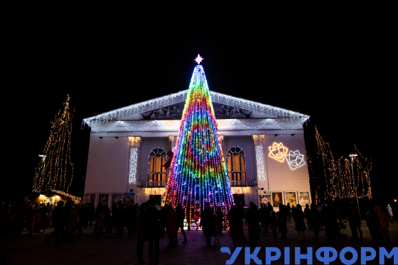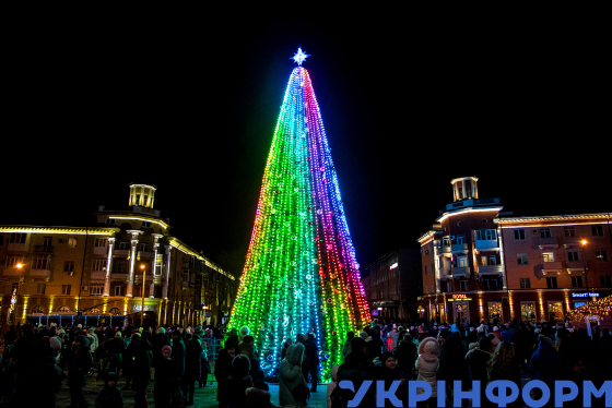 Головна новорічна ялинка під час церемонії відкриття на Театральній площі міста, Маріуполь, Донецька область, 19 грудня 2018 року. Фото Станіслава Іванова.