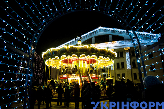 Дитяча карусель та різдвяно-новорічна ілюмінація в день відкриття головної новорічної ялинки на Театральній площі міста, Маріуполь, Донецька область, 19 грудня 2018 року. Фото Станіслава Іванова.
