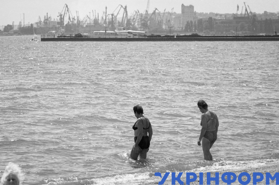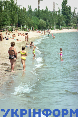 Відпочивальники на міському пляжі ігнорують попередження про бактеріологічне забруднення моря, Маріуполь, Донецька область, 12 серпня 1998 року. Фото Бориса Дембицького.