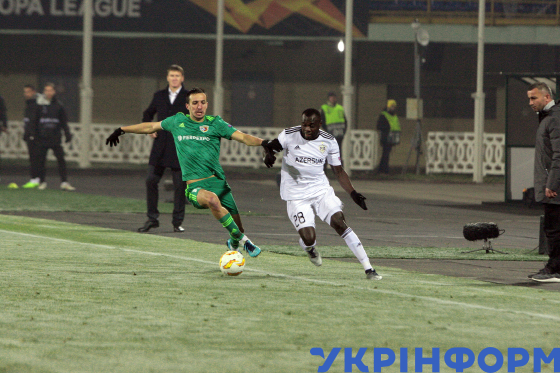 Ігровий момент матчу 4-го туру групового етапу Ліги Європи УЄФА між ФК “Ворскла” (Полтава) і ФК “Карабах” (Агдам, Азербайджан), що завершився з рахунком 0:1 на користь азербайджанської команди, на стадіоні “Ворскла” імені Олексія Бутовського, Полтава, 8 листопада 2018 року.