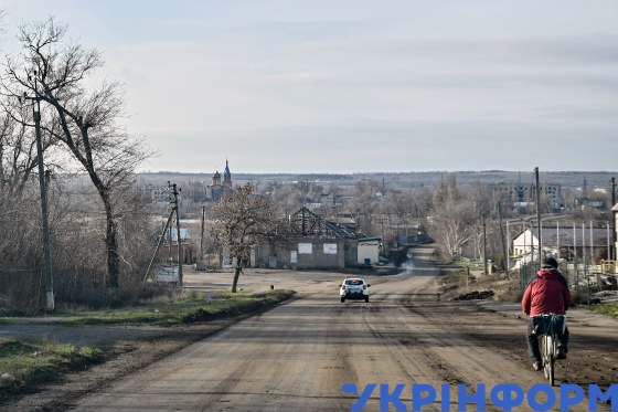 Поодинокий велосипедист і патрульний автомобіль їдуть вулицею у прифронтовому Оріхові, Запорізька область, 8 січня 2025 року.