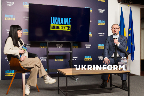 Модераторка Ольга Атаманова і голова Держатомрегулювання – головний державний інспектор з ядерної та радіаційної безпеки України Олег Коріков беруть участь у брифінгу “Ситуація на АЕС після ворожих ударів” у Медіацентрі Україна, Київ, 12 лютого 2026 року.