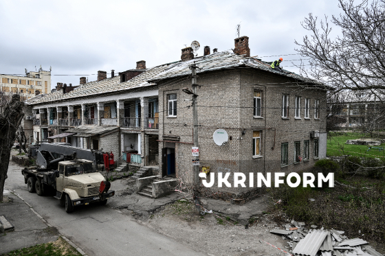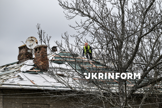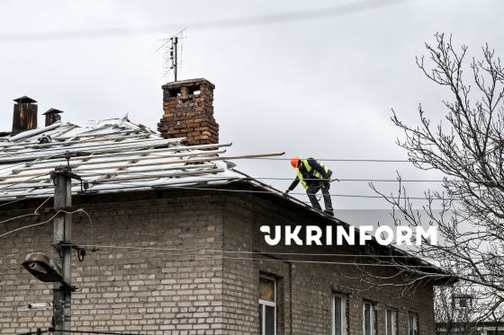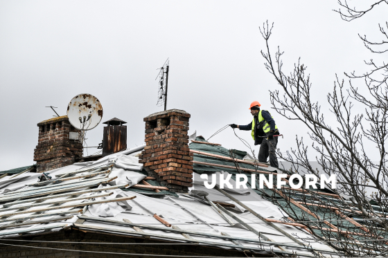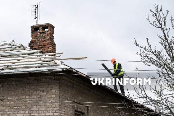 Фахівець ремонтує дах одного з двоповерхових будинків, що зазнали руйнувань внаслідок російського обстрілу Запоріжжя наприкінці 2025 року, Запоріжжя, 31 березня 2026 року. За останні два місяці комунальні служби демонтували близько 770 кв. м шиферного даху, уклали нову мембрану та обрешітку і відремонтували стропильні конструкції. З початку року у Запоріжжі відновили дахи приблизно на 4 000 кв. м у шести будинках. Ще більш як 10 000 кв. м покрівель зараз ремонтуються на дев’яти будинках. Планується ремонт покрівлі ще одинадцяти будинків.
