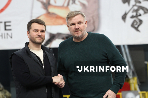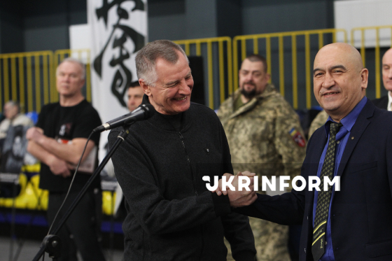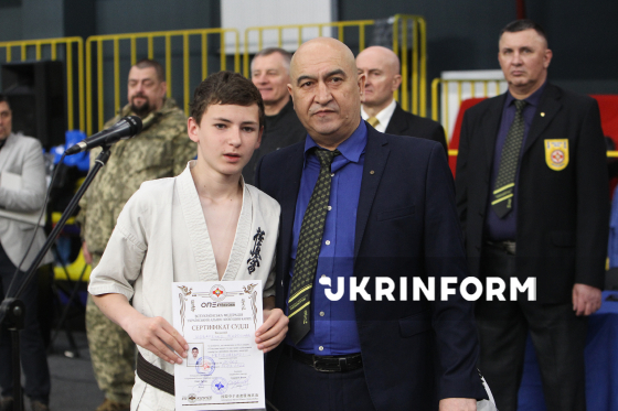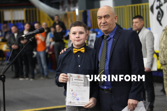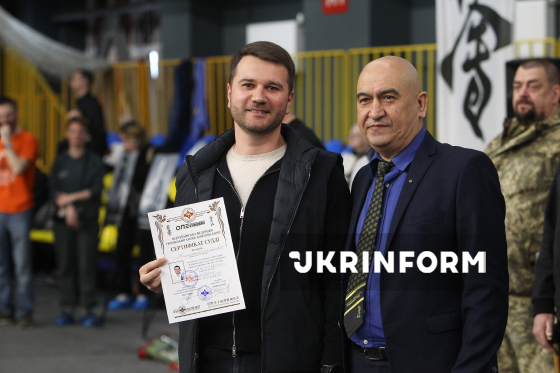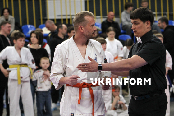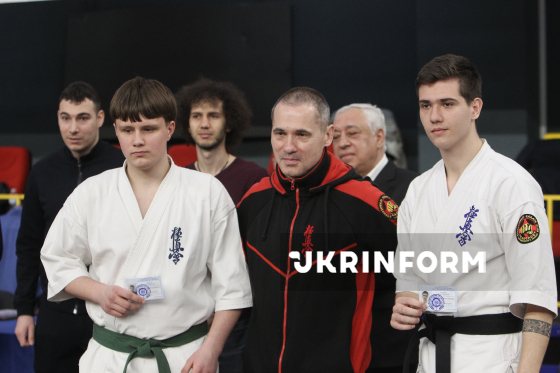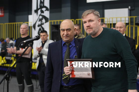 Директор ГО "Обласна федерація кіокушин карате Дніпропетровської області" Гарик Мелікян (праворуч) бере участь в урочистому нагородженні у межах чемпіонату України з кіокушин карате у спортивному комплексі “Олімпійські резерви”, Дніпро, 4 квітня 2026 року. Понад 450 спортсменів із 12 областей України змагалися у розділах “Куміте” та “Ката”. Участь у змаганнях взяли діти від шести років і досвідчені спортсмени.