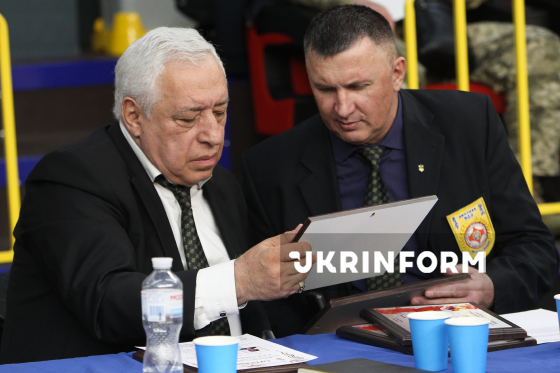 Голова Дніпропетровського обласного об_qt_єднання ветеранів Афганістану Віктор Волошин і головний суддя Атаєв Зокиржон беруть участь в урочистому нагородженні у межах чемпіонату України з кіокушин карате у спортивному комплексі “Олімпійські резерви”, Дніпро, 4 квітня 2026 року. Понад 450 спортсменів із 12 областей України змагалися у розділах “Куміте” та “Ката”. Участь у змаганнях взяли діти від шести років і досвідчені спортсмени.