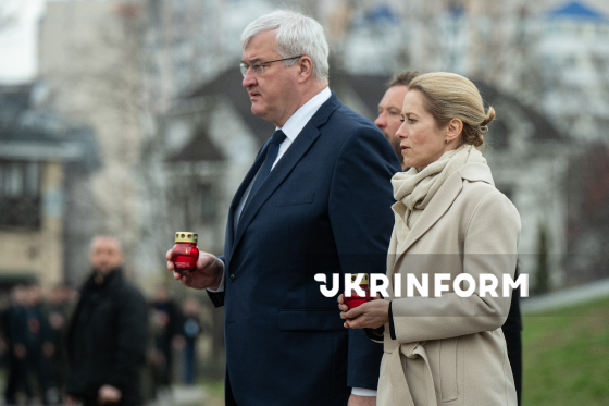 Висока представниця ЄС із закордонних справ та політики безпеки Кая Каллас, яка прибула до України з офіційним візитом разом з міністрами країн ЄС, та міністр закордонних справ України Андрій Сибіга (у центрі справа наліво) з запаленими лампадками вшановують пам’ять жертв російської окупації біля меморіалу на території храму святого Апостола Андрія Первозванного, Буча, Київська область, 31 березня 2026 року.